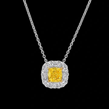 The exquisitely feminine hue of a cushion cut Fancy Yellow diamond is enhanced by a delicate halo of pavé white diamonds in our Icon pendant in yellow gold and white gold. Radiating pure joy, the bewitching design showcases Graff's expertise in crafting yellow diamond jewels that capture the eye and the heart.