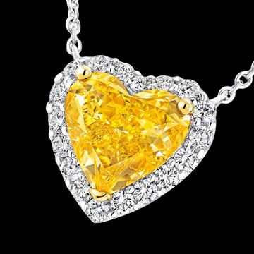 Displaying the rarest and most sought-after Fancy Vivid hue, an elegant heart shape yellow diamond conjures the warmth and brightness of the sun's rays in our Icon pendant in yellow and white gold. Cut and polished to display exceptional brilliance and fire, the centre stone is complemented by a delicate halo of pavé white diamonds. With a legacy of cutting and polishing many of the world’s most fabulous yellow stones.