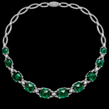 Ten exquisite emeralds are gracefully framed by 723 brilliant