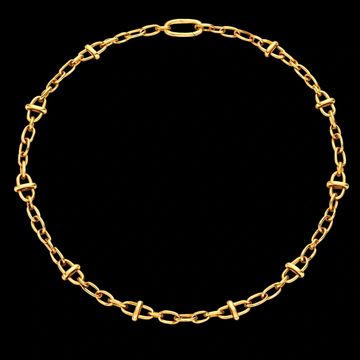 Presented against a deep black backdrop, The Nocturne Link Necklace reveals the radiant beauty of solid 18-carat yellow gold in its purest form. Expertly crafted, the design features a sequence of polished oval links accented by distinctive sculptural connectors, creating a refined rhythm of light and form.