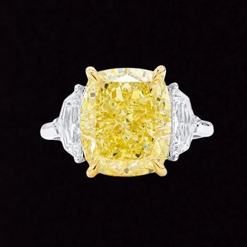 Experience the elegance of our Natural Fancy Light Yellow Diamond Ring. The centerpiece features an 8.04-carat cushion-shaped yellow diamond with a captivating fancy light yellow hue and VVS2 clarity, exuding brilliance. Two heart-shaped white diamonds (1.05 carats, E-F color, VS clarity) enhance its charm. Set in 18K white and yellow gold, the ring weighs 5.11 grams. GIA certified , this size 7.25 ring can be resized. A timeless masterpiece of luxury and beauty.