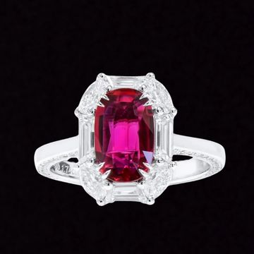Elegance and passion unite in our Natural Unheated Red Ruby Ring, featuring a 2.12-carat cushion-cut ruby from Mozambique with a vivid, fiery hue. Accented by 1.74 carats of white diamonds, the total weight is 3.86 carats. Set in 18K white gold, this luxurious piece is GRS certified , ensuring the authenticity and beauty of its gemstones. A sophisticated expression of timeless artistry and craftsmanship.