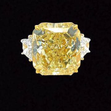 Introducing the 32.01-carat Radiant Cut Fancy Yellow Diamond Ring, featuring a stunning SI2 clarity yellow diamond, certified by GIA. Set in a handmade platinum and 18K yellow gold setting, it's flanked by two perfectly matched trapezoid side stones totaling 2.66 carats, F in color and SI1 in clarity. Accompanied by GIA certification, this ring is a masterpiece of elegance and craftsmanship.