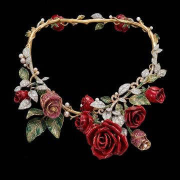 A romantic expression of haute joaillerie, The Rosaria Garden Necklace is crafted in 18-karat gold and designed as an enchanting flowering vine. Sculpted branches flow gracefully around the neckline, adorned with exquisite red rose blossoms, diamond-set leaves, and delicate pearls that evoke the beauty of a blooming garden.