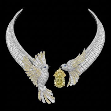A striking masterpiece of haute joaillerie, The Celestial Wings Necklace is crafted in luminous 18-karat white gold and adorned with an extraordinary arrangement of brilliant-cut and baguette diamonds. Two sculptural birds emerge gracefully from the diamond-set collar, their wings detailed with delicate yellow diamonds that shimmer with radiant warmth.