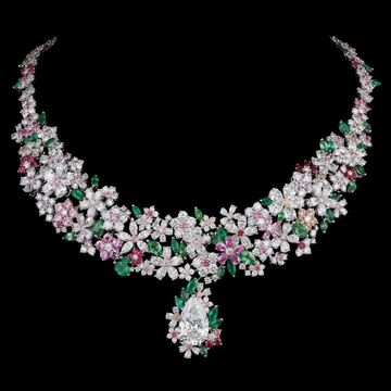 The necklace is adorned with an extraordinary arrangement of brilliant-cut white diamonds, vibrant emeralds, and delicate pink sapphires.