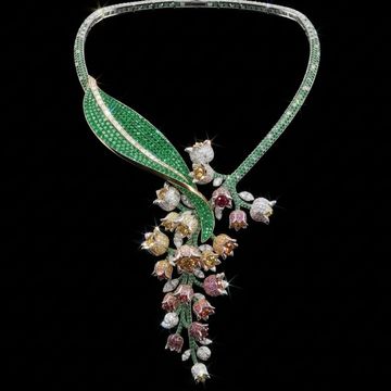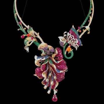A vibrant masterpiece of high jewellery artistry, The Jardin Fantaisie Necklace is crafted in 18-karat white and yellow gold, celebrating the beauty of nature in full bloom. The design unfolds as an enchanting garden of sculptural flowers, butterflies, and flowing leaves, set with an extraordinary array of coloured gemstones.