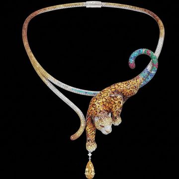 A bold expression of haute joaillerie, The Majestic Panther Necklace is crafted in 18-karat white and yellow gold, adorned with an extraordinary array of brilliant diamonds and vibrant coloured gemstones. The sculptural panther gracefully drapes across the necklace, its body intricately set with golden and cognac diamonds that recreate the iconic pattern of the wild feline.