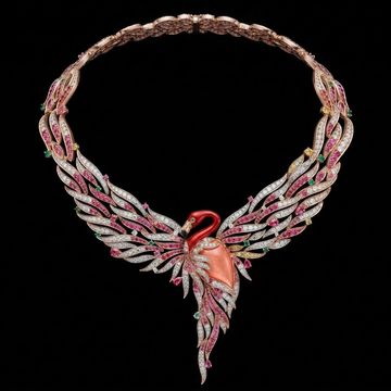 The Majestic Flamingo Necklace is crafted in 18-karat white and yellow gold, adorned with an extraordinary array of brilliant diamonds and vibrant coloured gemstones. The sculptural panther gracefully drapes across the necklace, its body intricately set with golden and cognac diamonds that recreate the iconic pattern of the wild feline.